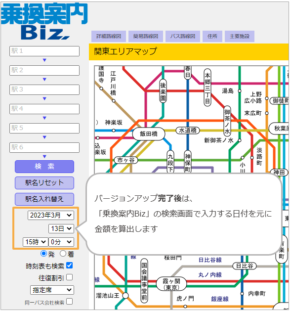 お手数ですが、料金改定時は「乗換案内」のバージョンアップ後に、