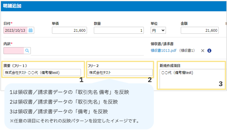 電帳法 領収書/請求書登録時に入力した「取引先名」と「備考」の情報を申請時の明細に反映する設定方法を知りたい