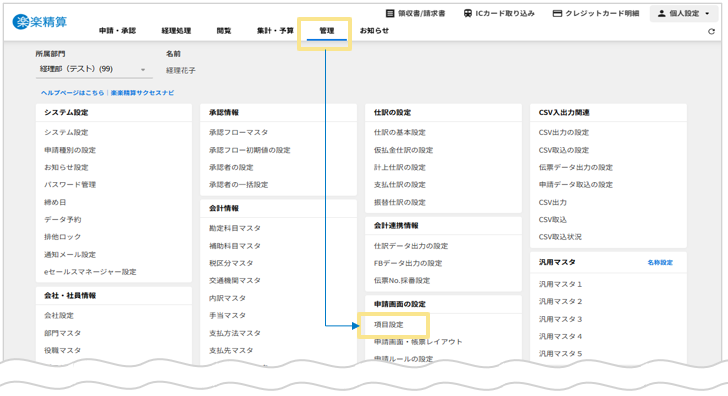 「管理」タブ >「項目設定」にて、それぞれ任意の明細項目に反映する設定ができます。