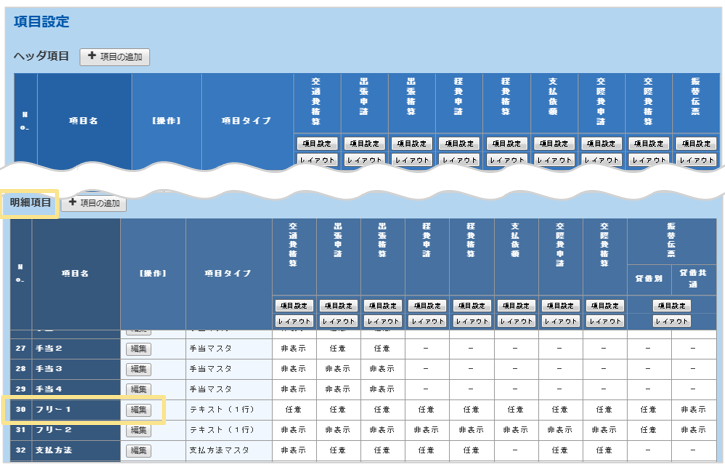 明細項目の「目的地」「出発」「到着」は項目タイプ「テキスト1行」ですが、