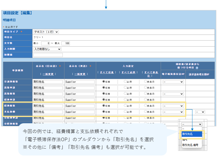 経費精算と支払依頼にて、明細のフリー1に「取引先名」を反映する