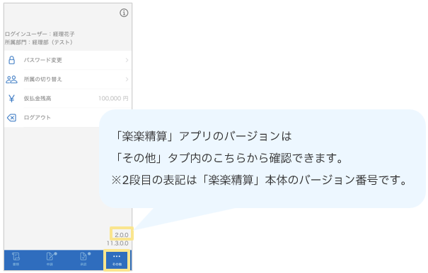 - 「楽楽精算」アプリ「その他」タブ画面の最下部に表示される「11.4.1.0」などの表記は