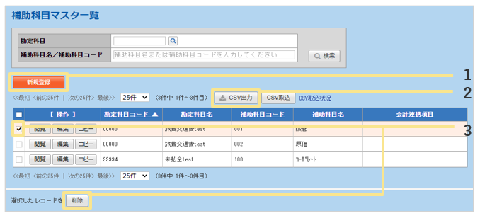 - 「管理 」タブ >「補助科目マスタ」メニューの画面と機能を説明します。