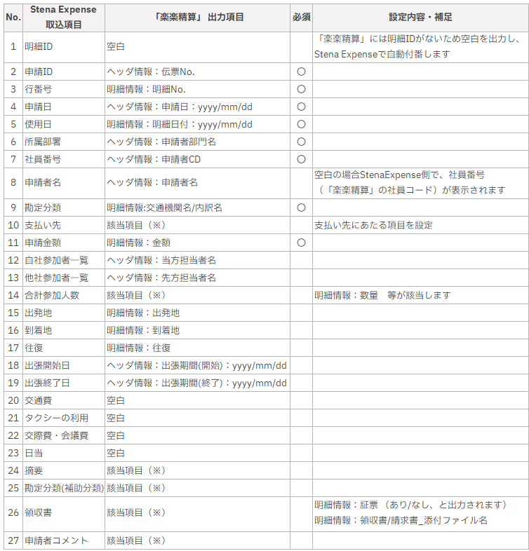 ※「該当項目(※)」はお客様の設定により楽楽精算内の項目有無が変わる項目です。