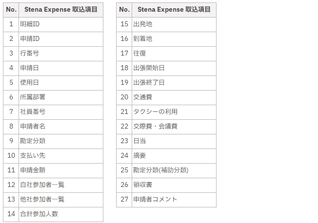 「Stena Expense」への取込には以下の項目が必要です。