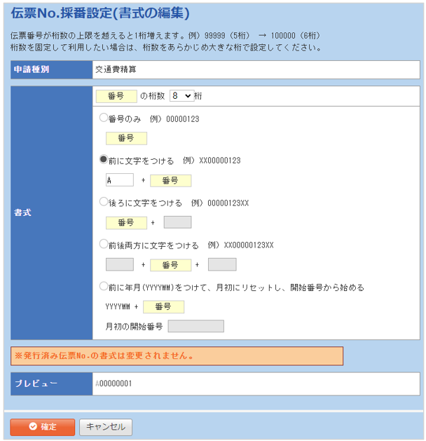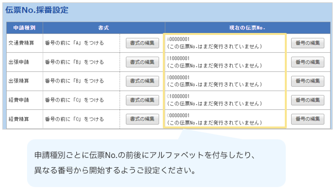 - 申請種別ごとに伝票No.の書式、番号を編集