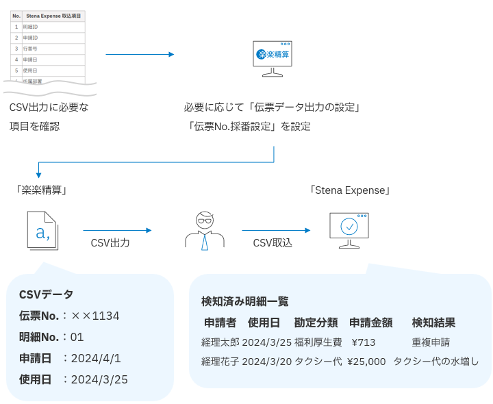 - 「楽楽精算」から、自動または手動でCSVデータを「Stena Expense」に連携し、