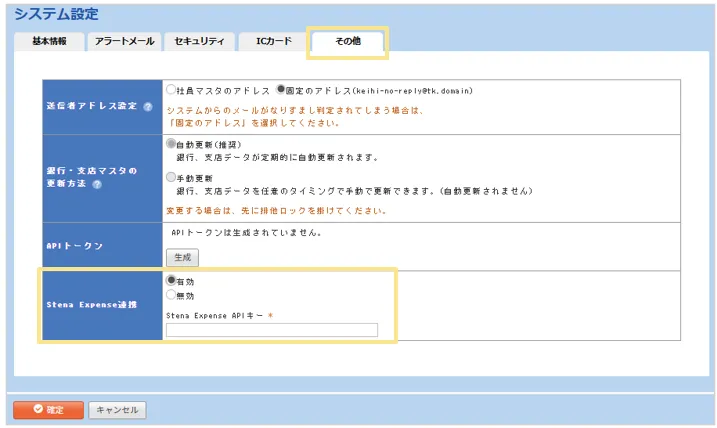 - 「管理」タブ >「システム設定」>「その他」タブの「Stena Expenseの連携」を「有効」に設定