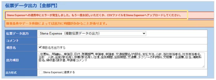 「Stena Expenseへの連携中にエラーが発生しました。もう一度お試しいただくか、CSVファイルを