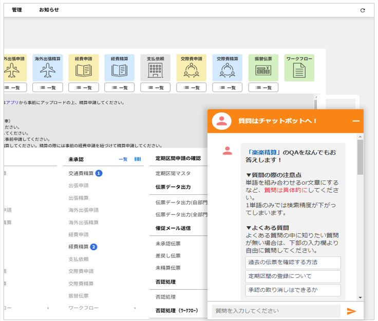| 「楽楽精算」のQAをなんでもお答えします! ▼質問の際の注意点 単語を組み合わせるor文章にするなど、質問は具体的にしてください。 1単語のみでは検索精度が下がってしまいます。 ▼よくある質問 よくある質問の中に知りたい質問が無い場合は、下部の入力欄より自由に質問してください。 {○}承認の取り消しはできるか {○}定期区間の登録について {○}過去の伝票を確認する方法 |