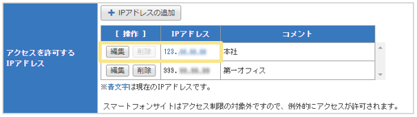 ※ 誤ったIPアドレスを登録してしまった場合は、「削除」ボタンをクリックすると削除されます。