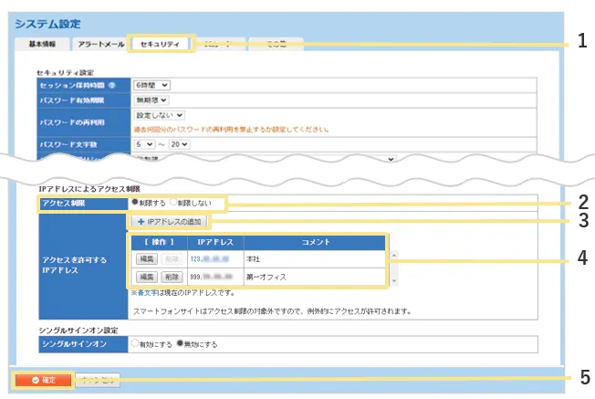 「システム設定」 > 「セキュリティタブ」内に「IPアドレス制限」の設定画面があります。
