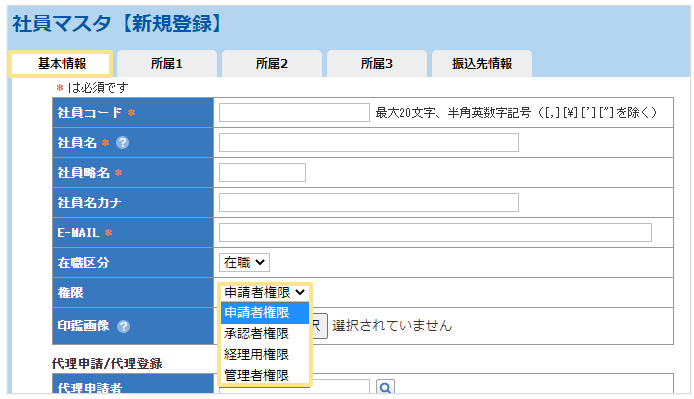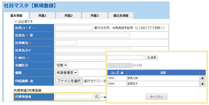 権限を付与されたユーザーは「社員マスタ」> 基本情報 > 代理申請者の選択肢として表示されます。