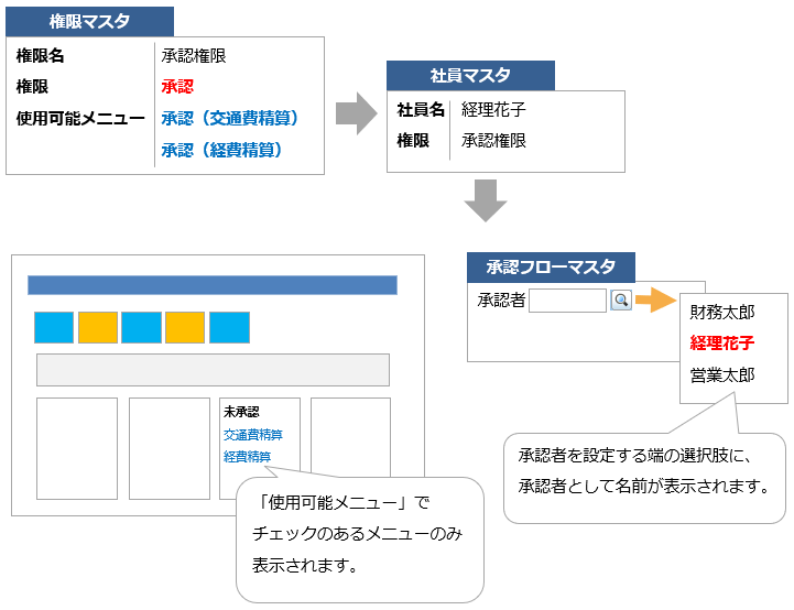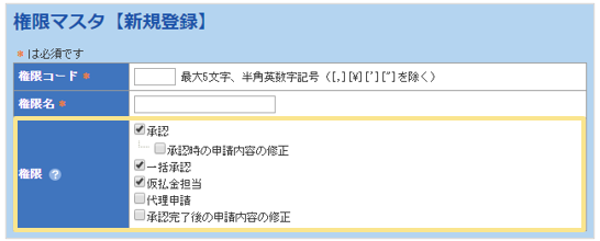 この他にも「承認者」を選択する画面などで「権限マスタ」の設定が関連します。