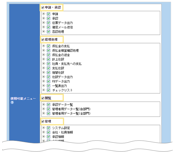- 「申請権限」「承認権限」「経理権限」など、パターンごとに権限や使用できるメニューを