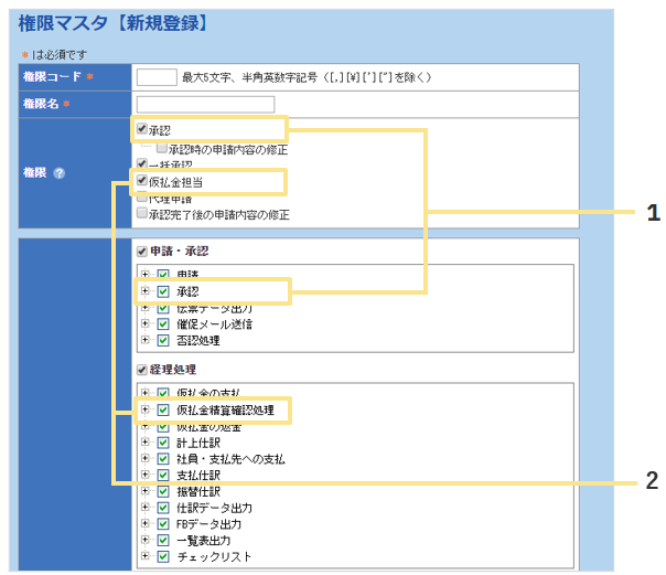 2. 「権限 > 仮払金担当」にチェックがない状態では、