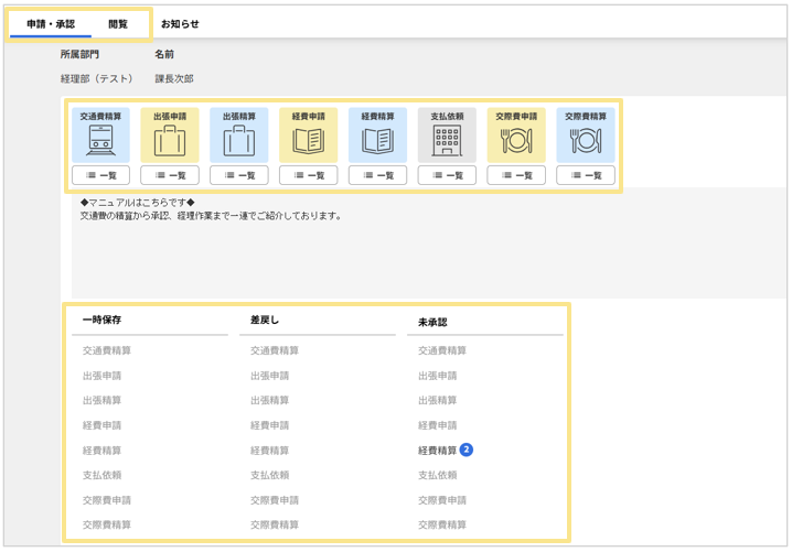 ※「申請・承認」タブだけでなく、「閲覧」「管理」など他のタブ内のメニューも同様に