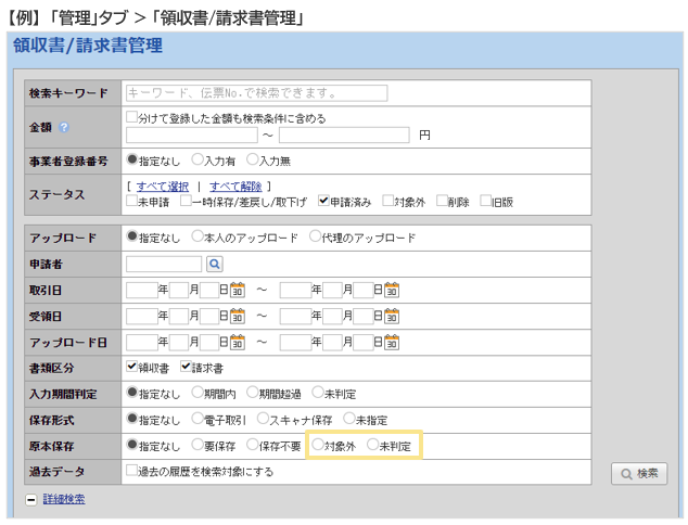 これまで領収書/請求書を検索する際、原本保存の検索条件は「要保存」「保存不要」のみでした。