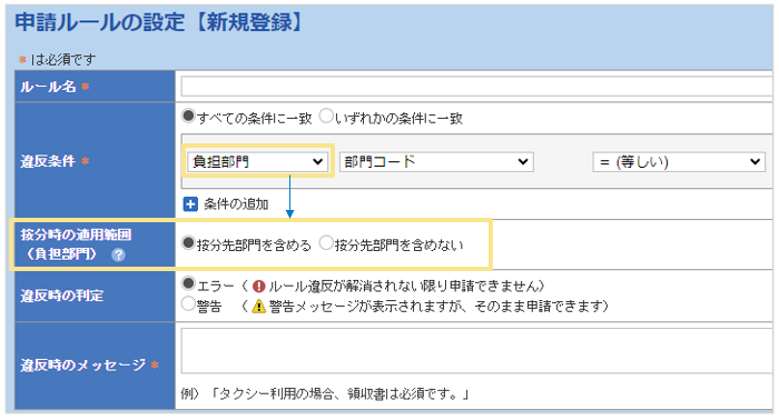 申請ルールの設定において違反条件に「負担部門」を設定すると