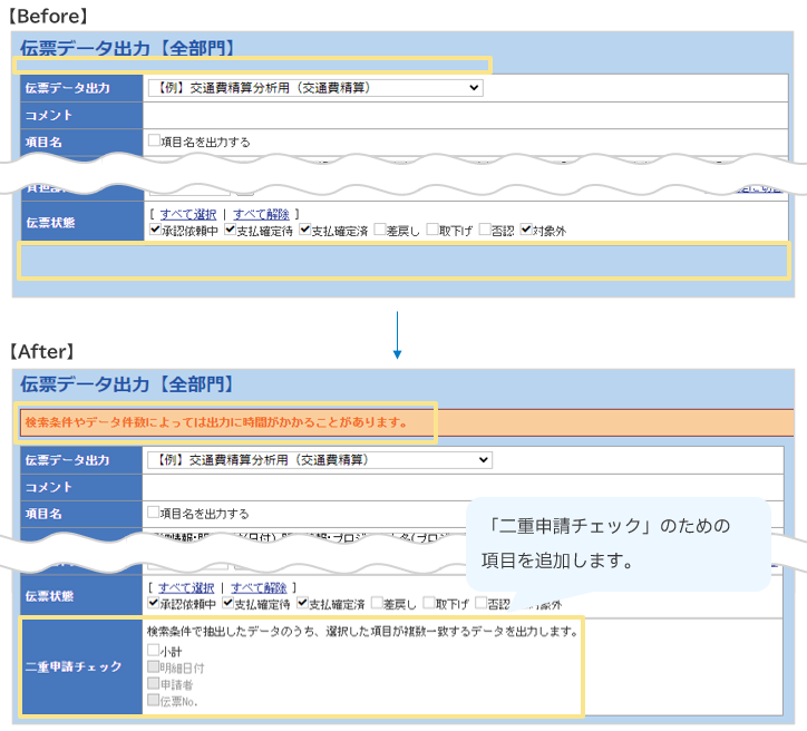 今回の機能追加により、「伝票データ出力」にて二重申請のチェック条件を絞り込んだ状態で