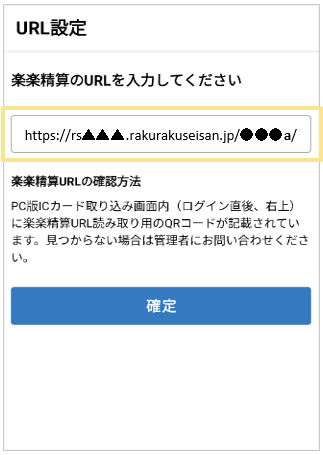 3. 「楽楽精算ICリーダー」アプリの「URL設定」画面が開くので、そのまま「確定」をクリック