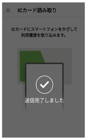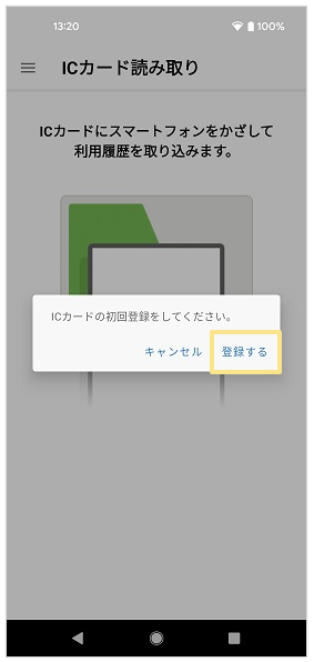 - 「ICカード読取り」の画面が表示されるので、ICカードをAndroid端末の背面のNFCマークにかざす