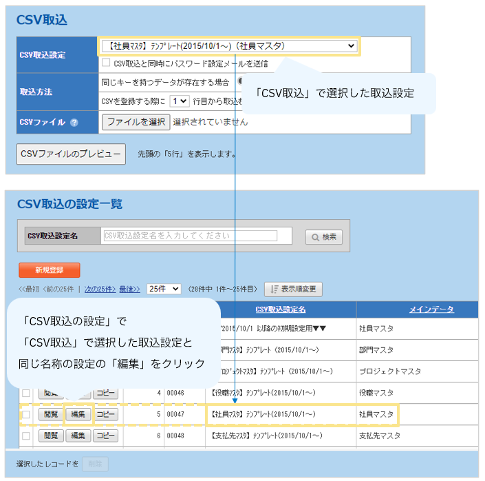 2.「CSV取込」を行った際に選択した「CSV取込設定」の「編集」をクリック