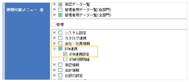 「管理」タブ > 「BTM連携」の項目を表示するかを設定することができます。