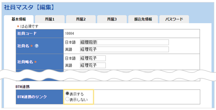 各社員に対して「BTM連携のリンクを表示するか」を設定することができます。
