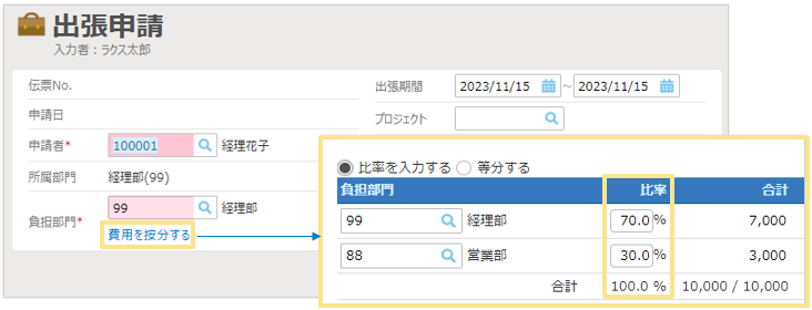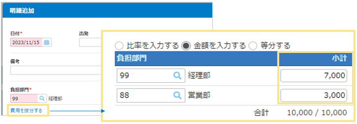 「費用按分」機能を利用することで、伝票全体または明細1行ごとに複数部門で費用を按分することができるんです!