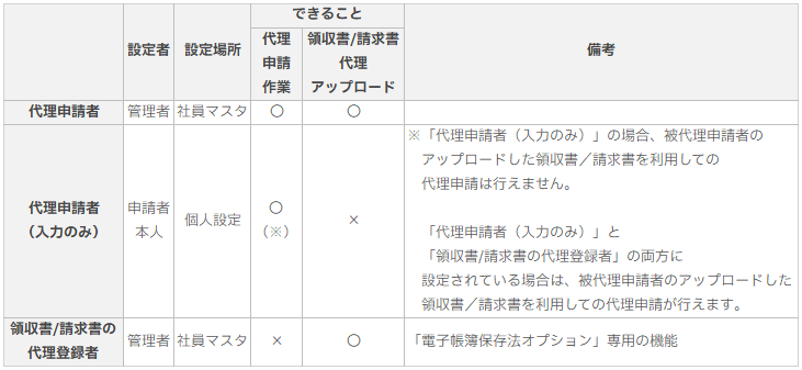 「代理申請者」「代理申請者(入力のみ)」「領収書/請求書の代理登録者」の違い