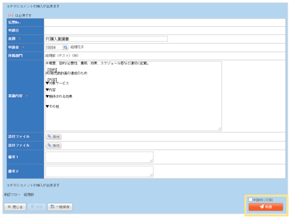 3. ワークフローの内容を入力して「申請」をクリック