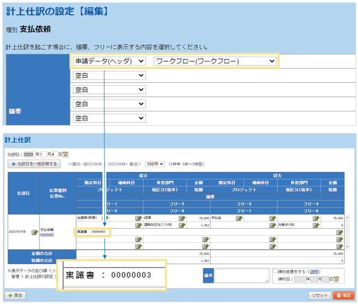仕訳データに「ワークフロー名」「ワークフロー伝票No.」を出力する場合は、