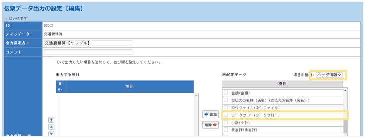 「伝票データ出力の設定」にて「出力項目」の「ヘッダ情報 」>「 ワークフロー(ワークフロー)」を設定し、「伝票データ出力」から出力します。