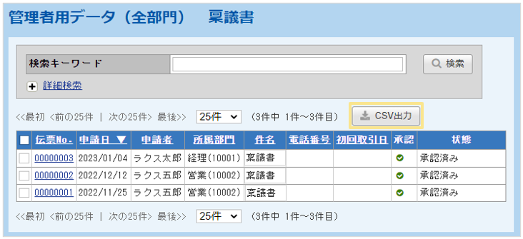 「閲覧」タブ >「管理者用データ一覧」の「CSV出力」ボタンより、ワークフローの伝票データを
