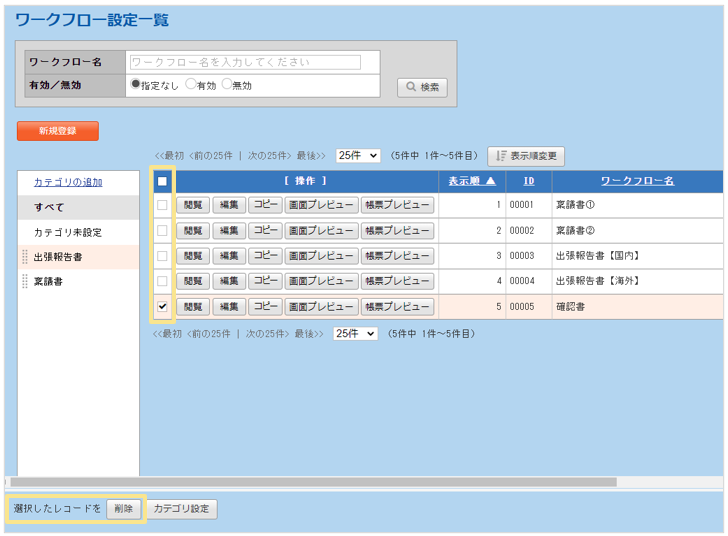 「ワークフロー設定一覧」画面にて、削除するワークフローにチェックを入れ、画面左下の