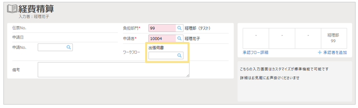 - ワークフローで作成した申請を、出張申請や出張精算、経費精算などの伝票へ紐づけができます。