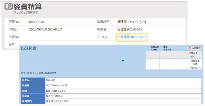 【例】1つの「稟議書」を「経費申請伝票」と「経費精算伝票」に紐づける