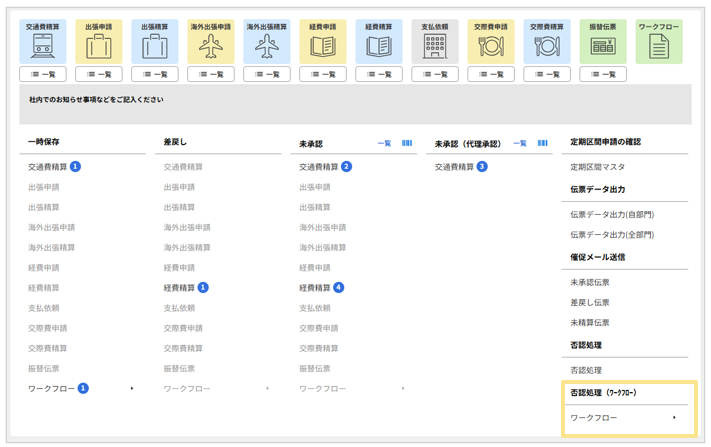 ワークフローの否認処理は「否認処理(ワークフロー)」より行います。