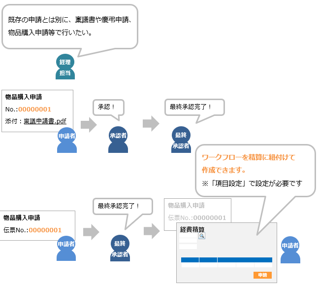 「ワークフロー」は出張申請などの事前申請とは異なり、同じワークフローを複数の伝票に