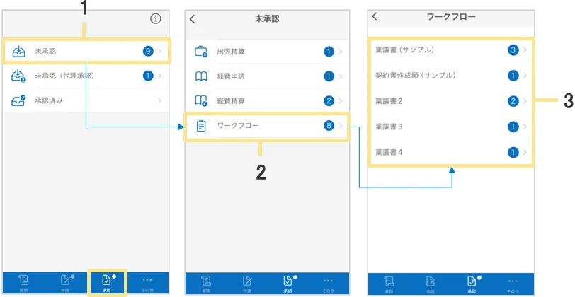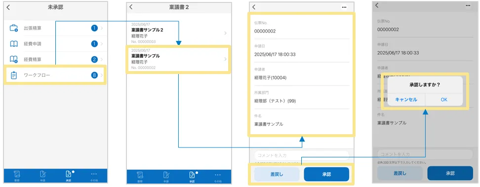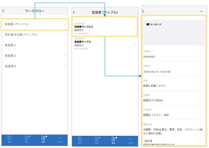 承認/差戻しをしたいワークフロー名をタップし、該当のワークフロー伝票をタップすると、