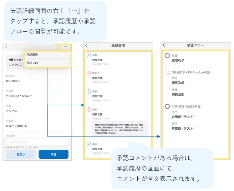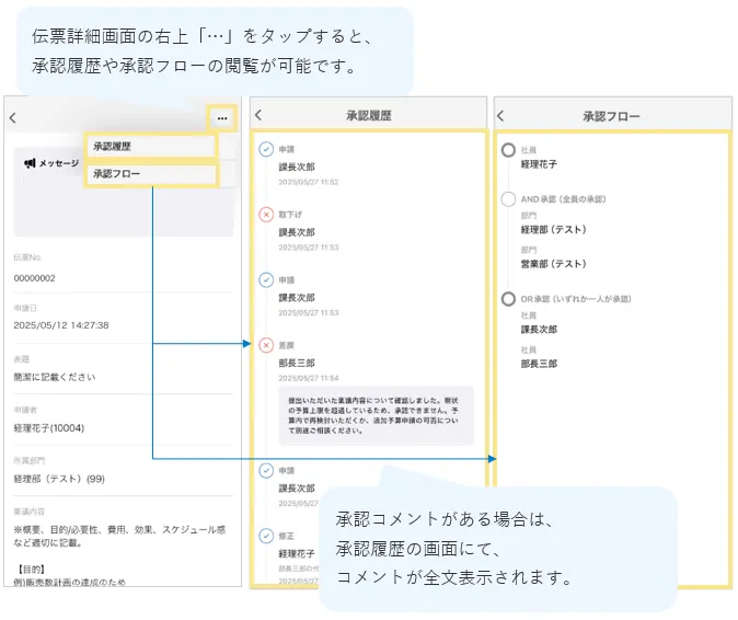 ワークフローの伝票詳細画面からワークフローの承認履歴や承認フローの確認が可能です。