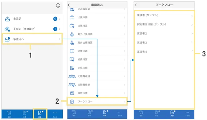承認済み一覧画面からワークフローをタップすると、ワークフロー一覧に遷移します。