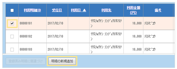 未精算のクレジットカード利用明細が一覧で表示されているので、精算を行う明細にチェックを入れ