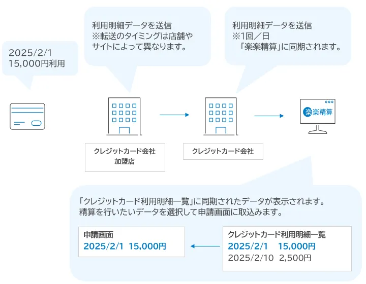 1~2か月ほどかかる可能性がございます。 - クレジットカード利用明細情報は、リアルタイムでは「楽楽精算」に送信されません。