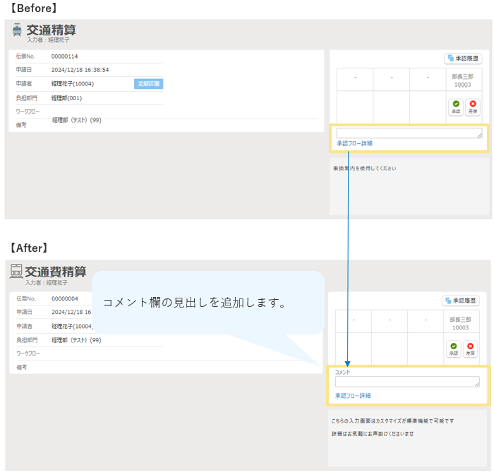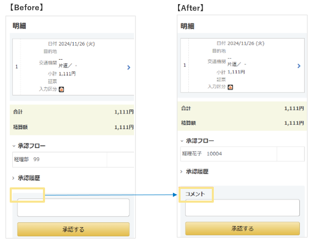そのため、今回の仕様変更で伝票閲覧画面(未承認・代理承認)に表示されるコメント欄に見出しを追加します。
