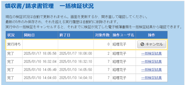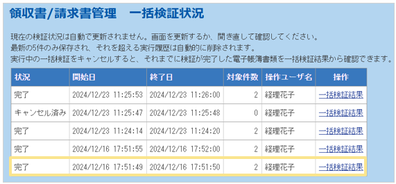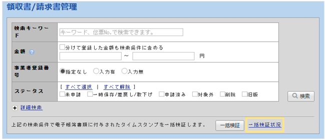 「管理」タブ >「領収書/請求書管理」>「一括検証状況」ボタンをクリックします。