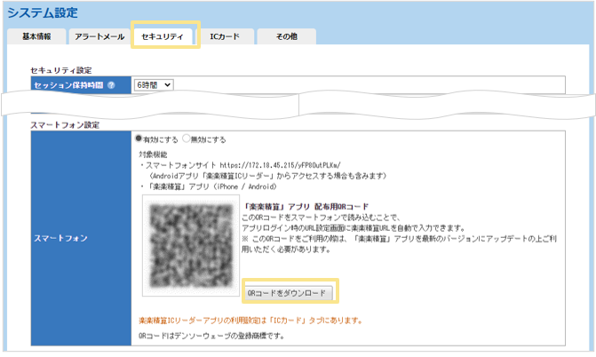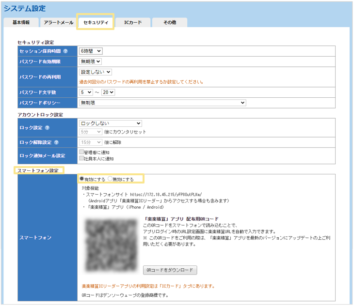 - 「セキュリティ」タブ >「スマートフォン設定」>「スマートフォン」を「有効にする」にチェック