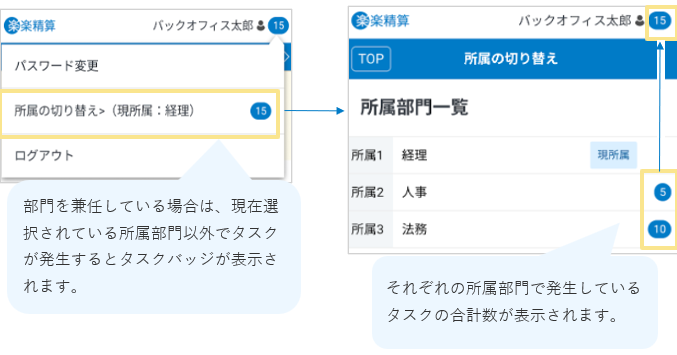 所属の切り替え : 複数の部門に所属している場合、所属の切り替えができます。