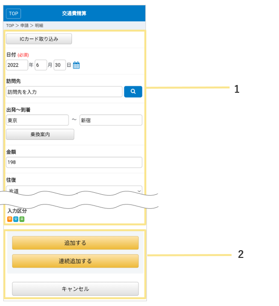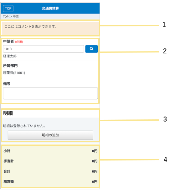 - 「交通費精算」をタップ入力画面(ヘッダ)を入力